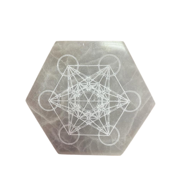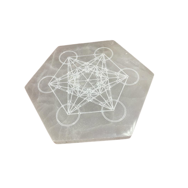 Płytka Selenitowa Duża - Sześciokąt. Wymiary 18 x 2 cm. Płytka selenitowa to piękna i funkcjonalna ozdoba, wykonana ręcznie z naturalnego kamienia selenitu. Na jej powierzchni znajduje się wygrawerowany