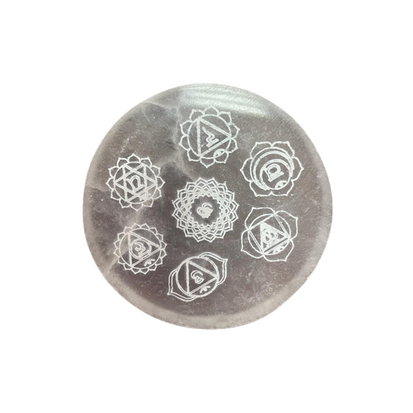 Płytka Selenitowa Mała - Czakra cz-b. Wymiary 8 x 2 cm. Okrągła płytka selenitowa to piękna i funkcjonalna ozdoba, wykonana ręcznie z naturalnego kamienia selenitu. Na jej powierzchni znajdują się wygrawerowane