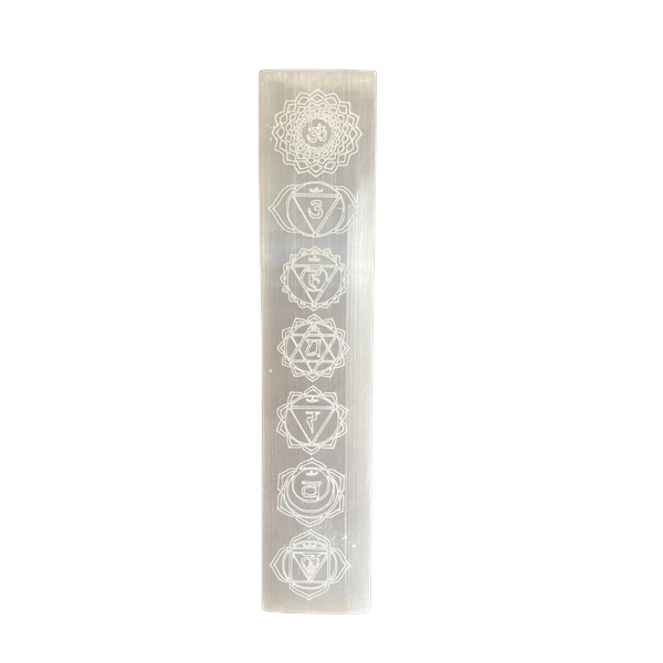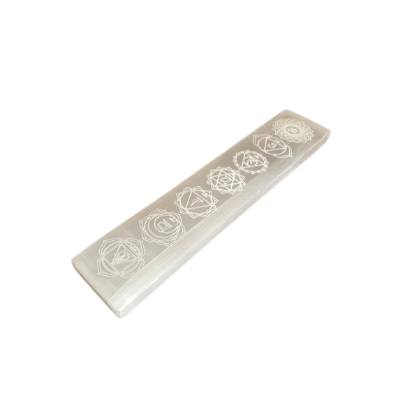 Płytka Selenitowa Prostokątna - Czakra. Wymiary 20 x 4,2 x 2 cm. Płytka selenitowa to piękna i funkcjonalna ozdoba, wykonana ręcznie z naturalnego kamienia selenitu. Na jej powierzchni znajdują się wygrawerowane