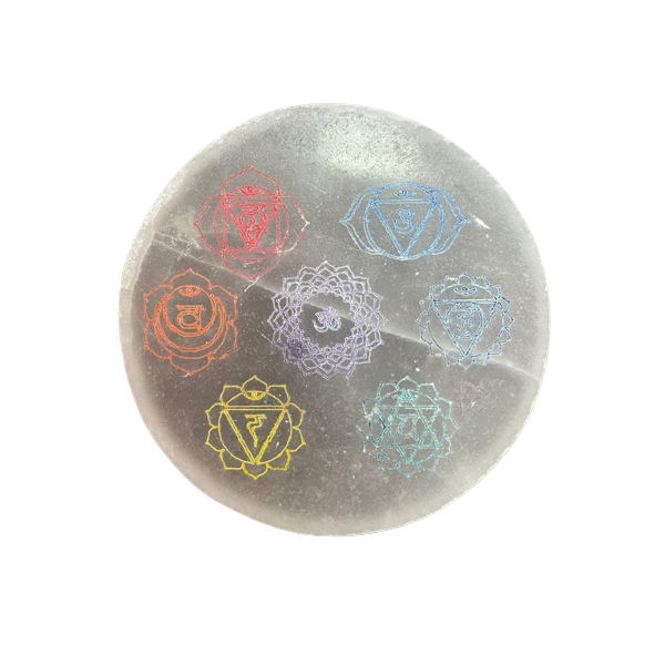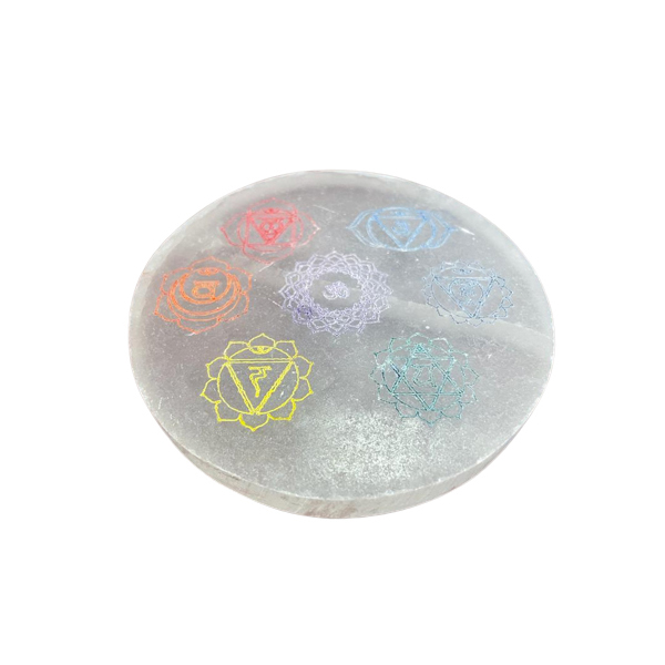 Płytka Selenitowa Średnia - Czakra. Wymiary 10 x 2 cm. Okrągła płytka selenitowa to piękna i funkcjonalna ozdoba, wykonana ręcznie z naturalnego kamienia selenitu. Na jej powierzchni znajdują się wygrawerowane kolorowe