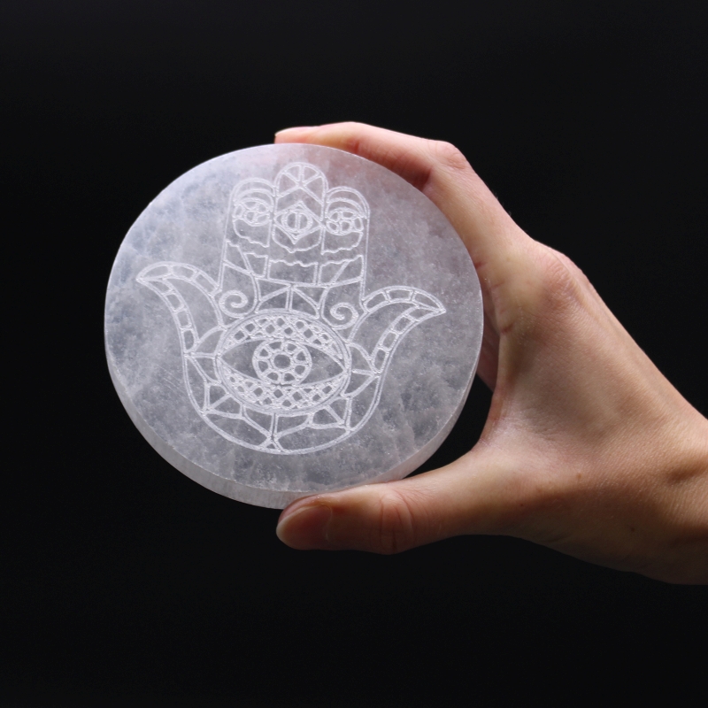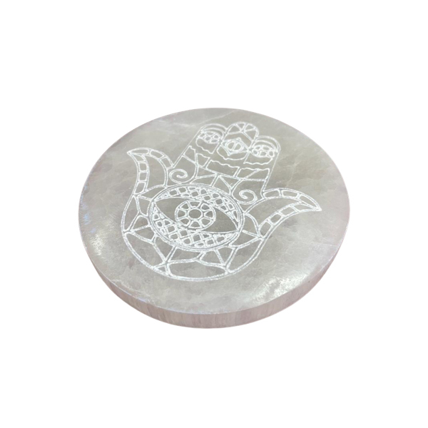 Płytka Selenitowa Średnia - Hamsa. Wymiary 10 x 2 cm. Okrągła płytka selenitowa to piękna i funkcjonalna ozdoba, wykonana ręcznie z naturalnego kamienia selenitu. Na jej powierzchni znajduje się wygrawerowany