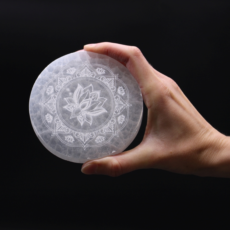 Płytka Selenitowa Średnia - Lotus Mandala. Wymiary 10 x 2 cm. Okrągła płytka selenitowa to piękna i funkcjonalna ozdoba, wykonana ręcznie z naturalnego kamienia selenitu. Na jej powierzchni znajduje się wygrawerowany