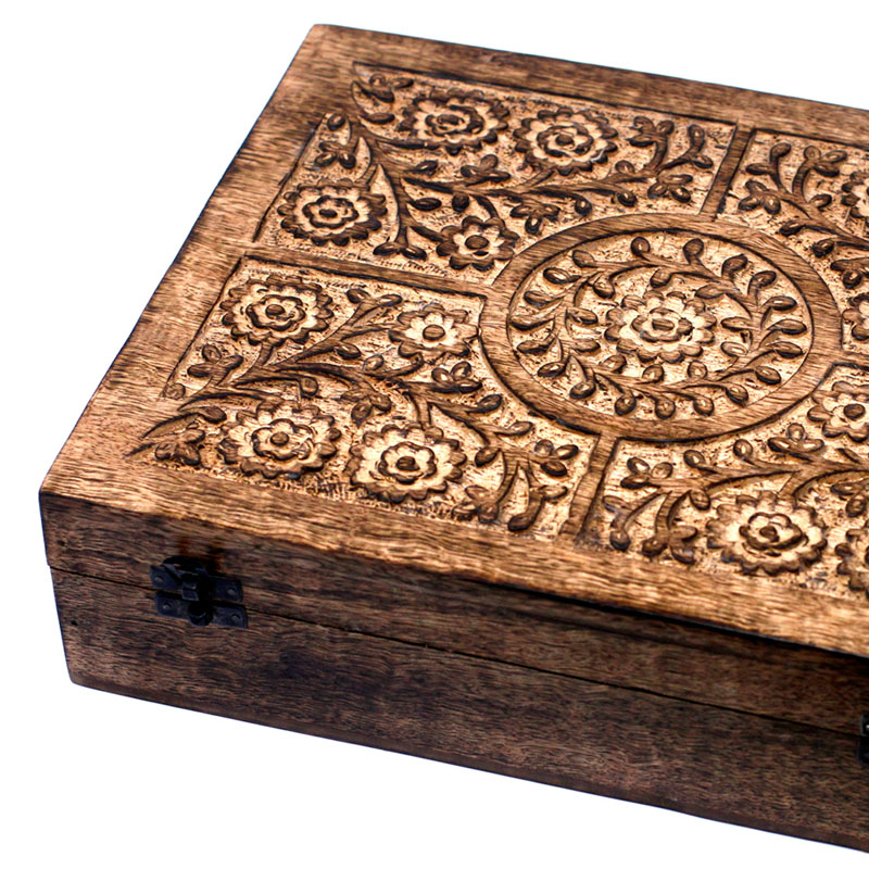 wysoko jakościowego drewna Mango z pięknymi, ręcznie rzeźbionymi ozdobami. Ręcznie wykonane ornamenty na pudełku to kwiaty oraz motywy roślinne. Zawiera