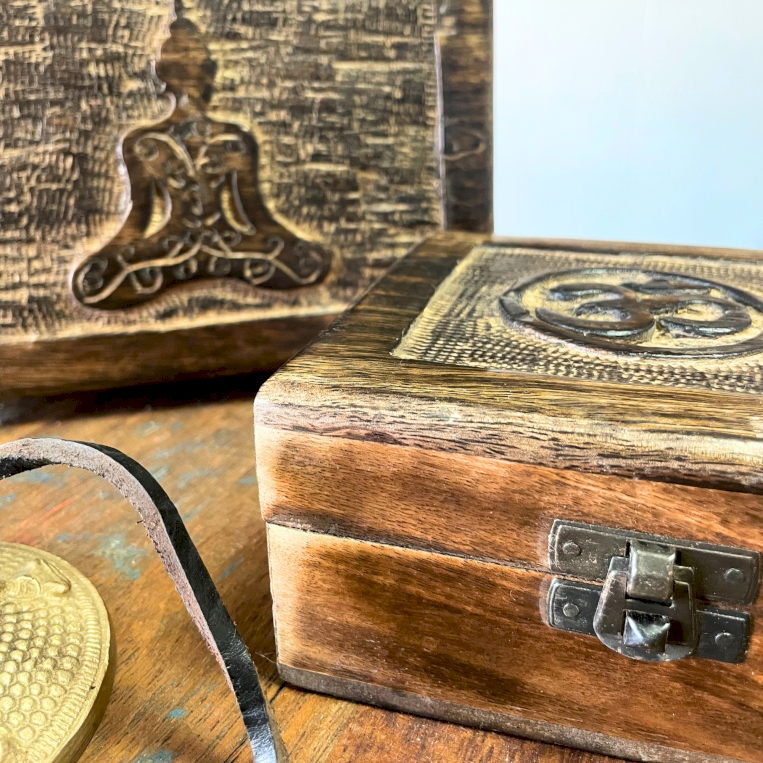 Pudełko ręcznie rzeźbione - Om. Wymiary 15 x 10 x 6 cm. To prawdziwa perełka rzemiosła, łącząca w sobie