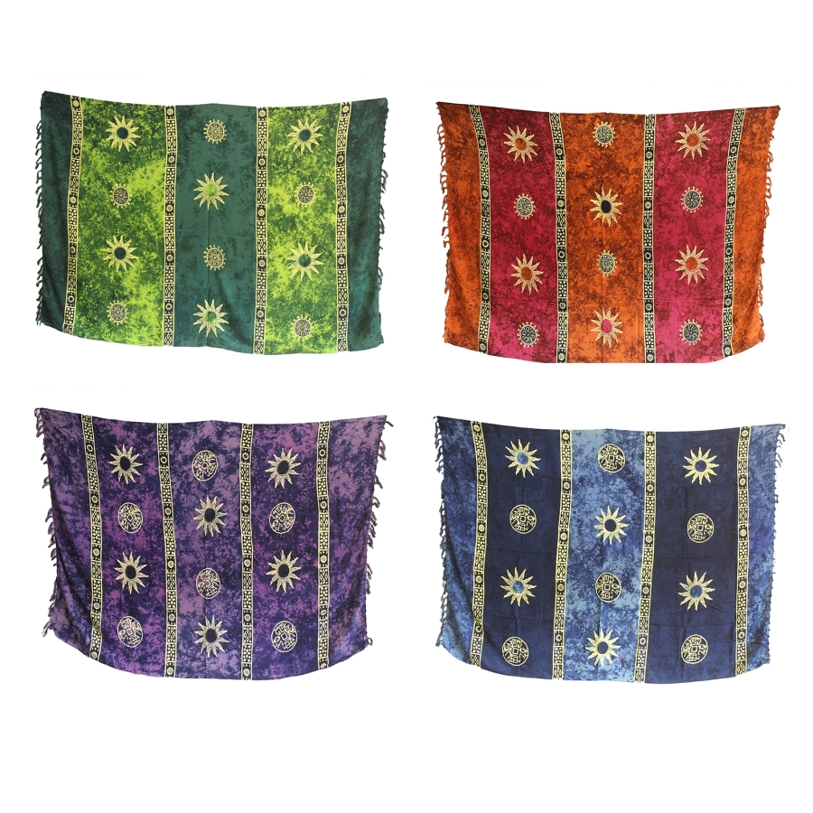 Sarongi z Bali - Symbole Słońca. Wymiary 155 x 120 cm. 4 kolory do wyboru. Inspirowane celtyckim stylem, mają idealny rozmiar, aby owinąć je w talii, czy zawiązać na szyi. Mogą być częścią stroju zarówno casualowego, jak i eleganckiego. Sarongi to popularny rodzaj tradycyjnego ubioru wywodzący się z indonezyjskiej wyspy Bali.