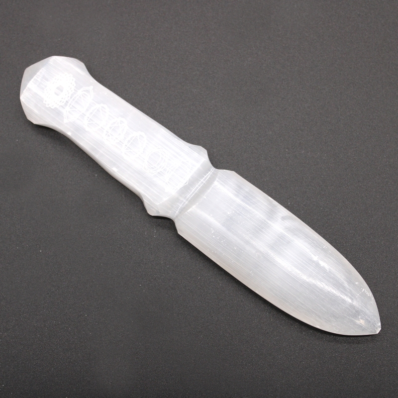 Selenitowy nóż rytualny - Czakra. Wymiary 20 x 4 cm. Selenitowe noże ceremonialne są wykonane i grawerowane ręcznie przez marokańskich rzemieślników. Mają silne znaczenie ezoteryczne ale świetnie sprawdzą się również jako przedmiot dekoracyjny. Noży tych nie używa się do fizycznego cięcia czegokolwiek, są raczej wspaniałym narzędziem