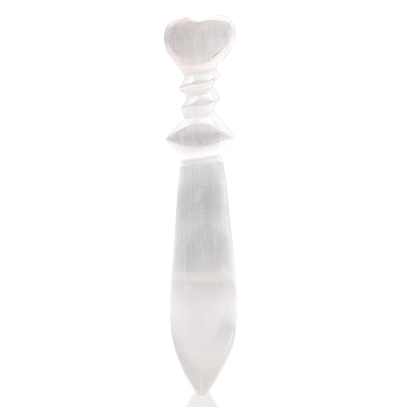Selenitowy nóż rytualny - Spiralny. Wymiary 25 x 4,5 cm. Selenitowe noże ceremonialne są wykonane i grawerowane ręcznie przez marokańskich rzemieślników. Mają silne znaczenie ezoteryczne ale świetnie sprawdzą się również jako przedmiot dekoracyjny. Noży tych nie używa się do fizycznego cięcia czegokolwiek, są raczej wspaniałym narzędziem
