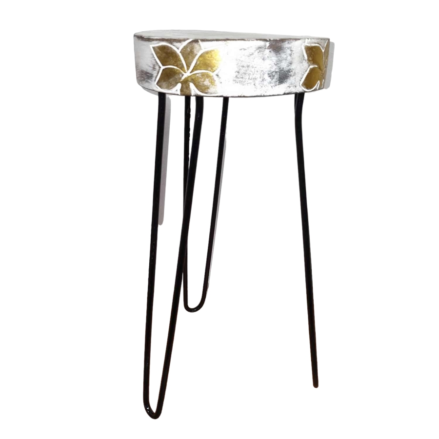 Dekoracyjny stolik z bielonym, drewnianym blatem i metalowymi nogami to wyjątkowy element wyposażenia wnętrz, który łączy funkcjonalność z artystycznym designem. Jego nietuzinkowy wygląd przyciąga uwagę, a subtelne zdobienia w formie złotych kwiatów na blacie nadają mu elegancji i uroku. Bielone wykończenie drewna podkreśla jego strukturę, wprowadzając do pomieszczenia lekkość i przytulność.