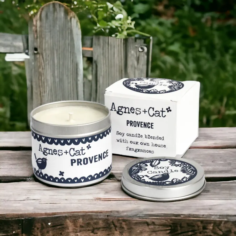 Świeca w puszce - Provence. Wymiary 7,5 x 6 cm. Provence to sojowa świeca inspirowana lawendowymi polami południowej Francji, o relaksującym aromacie lawendy i ambry, które wprowadzą do wnętrza spokój i harmonię. Zapach jest świeży, lekko ziołowy, a zarazem otulający, idealny na chwile wyciszenia lub domową aromaterapię. Designerska puszka i ekologiczne opakowanie czynią ją świetnym upominkiem, a naturalny skład gwarantuje bezpieczne i czyste spalanie. Świeca w puszce Provence