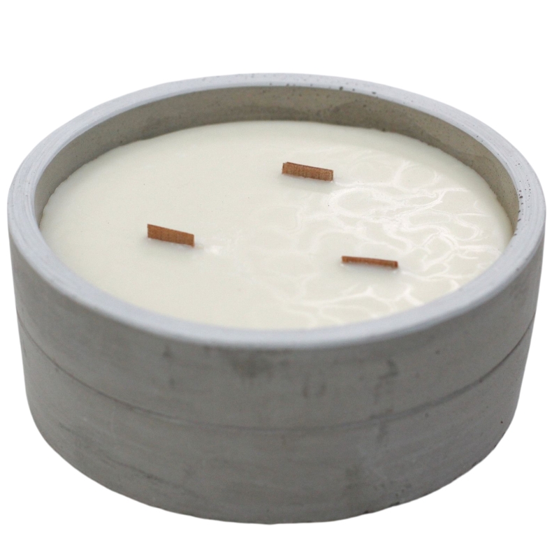 trzaskanie knota buduje kameralną atmosferę. Betonowy pojemnik podkreśla minimalistyczny styl świecy i po wypaleniu wosku może