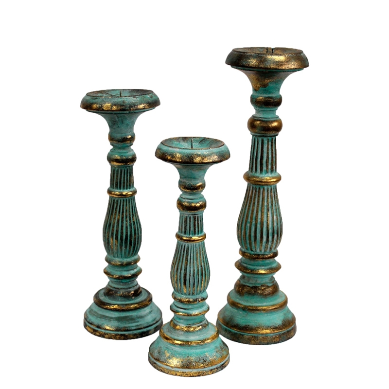 Świecznik drewniany Vintage - Turkusowy Średni. Wymiary 12 x 12 x 34 cm. Świecznik vintage to produkt wysokiej jakości, który będzie się wyróżniał w każdym domu. Został ręcznie wykonany z drewna albasia, którego olbrzymią tą jest trwałość. Dodatkowo aby dodać szlachetności i elegancji posiada wykończenia w złotym kolorze. Na szczycie zamocowano metalowy kolec na świeczkę.