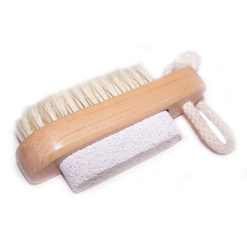 Szczotka z pumeksem. Wymiary 11 x 4 cm. Poręczna szczotka do pielęgnacji stóp i dłoni, wyposażona w naturalne włosie z dzika oraz trwały pumeks, doskonale sprawdza się do usuwania martwego naskórka, pielęgnacji paznokci i wygładzania skóry. Dwustronna konstrukcja umożliwia precyzyjne oczyszczanie i złuszczanie, a drewniany uchwyt ze sznurkiem zapewnia wygodne użycie i przechowywanie produktu po zabiegu. Szczotka z pumeksem jest idealna do codziennej higieny, zarówno na sucho, jak i na mokro.Szczotka z pumeksem
