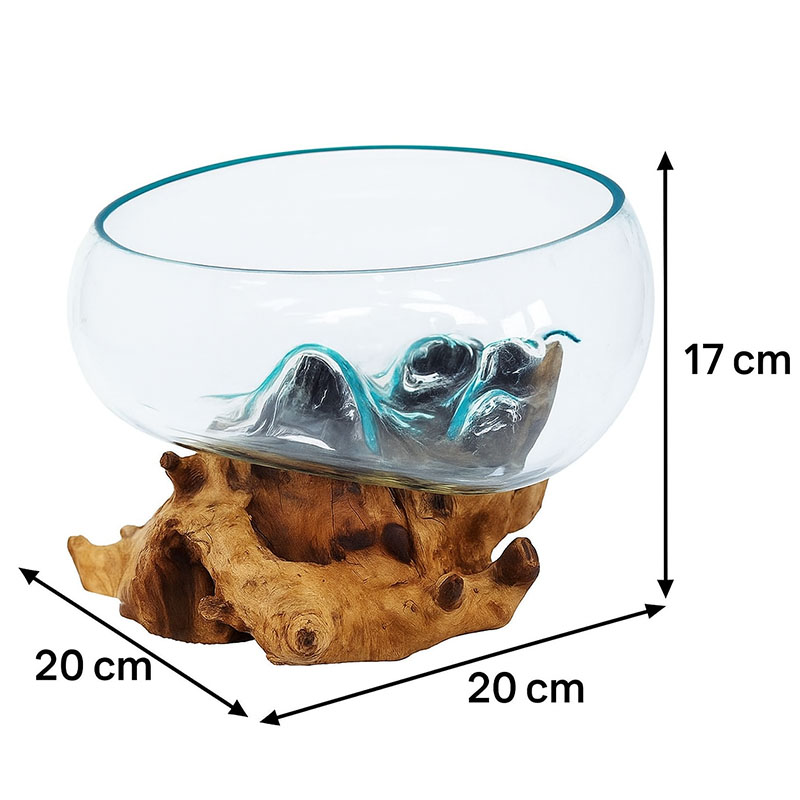 Dzięki temu połączeniu szkła i drewna, misa staje się wyjątkową ozdobą, idealnie pasującą do wnętrz o stylu boho, rustykalnym lub nowoczesnym. Szklana misa wtopiona w drewno może być używana jako dekoracyjna misa na owoce, kwiaty, świeczki lub drobne ozdoby. Sama w sobie również stanowi efektowny akcent w każdym pomieszczeniu. Jej oryginalny design przyciąga uwagę i wprowadza do wnętrza naturalny, artystyczny akcent.