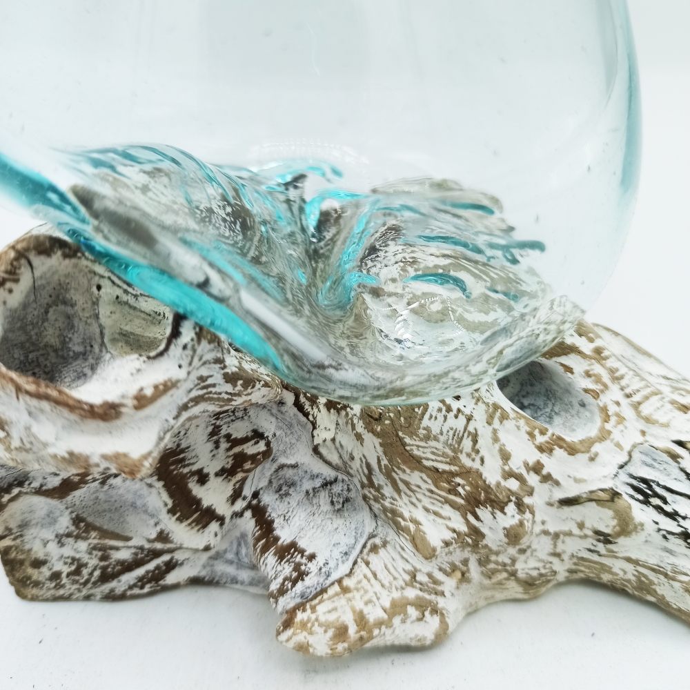Szklana Misa Wtopiona w Drewno - Mała Misa. Wymiary 13 x 11 x 10 cm. Wyjątkowa dekoracja, która doda uroku każdemu wnętrzu. Elegancka szklana misa, artystycznie wtopiona w naturalne drewno, to unikalna ozdoba wykonana z wysokiej jakości szkła oraz starannie wyselekcjonowanego drewna, co gwarantuje trwałość i estetykę na najwyższym poziomie. Ręcznie dmuchane szkło tworzy delikatną, przezroczystą misę o organicznych kształtach, a jego gładka, błyszcząca powierzchnia pięknie odbija światło. Podstawa wykonana jest z naturalnego, bielonego drewna o rustykalnym wyglądzie, z widocznymi słojami i naturalnymi przebarwieniami, które dodają charakteru i unikalności każdemu egzemplarzowi.