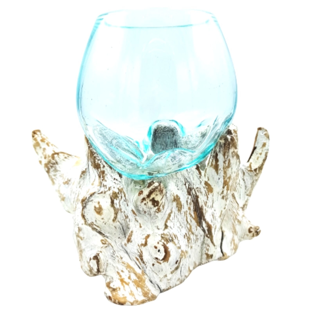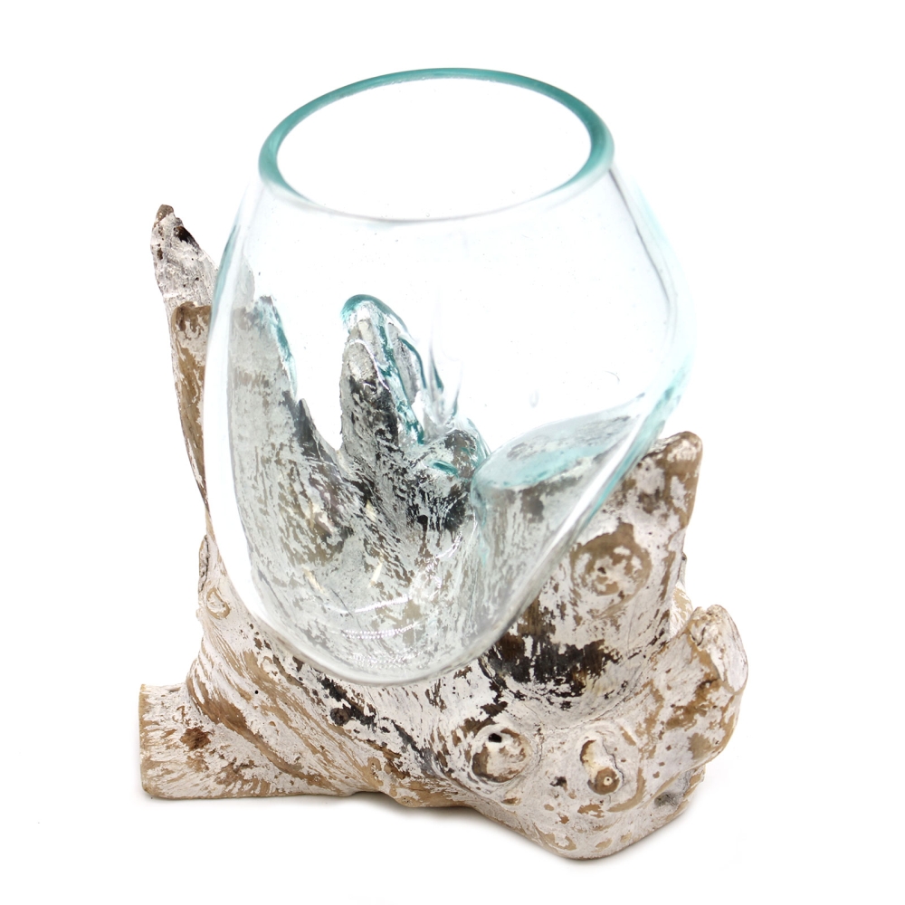 Szklana Misa Wtopiona w Drewno - Średnia Misa. Wymiary 18 x 13 x 13 cm. Wyjątkowa dekoracja, która doda uroku każdemu wnętrzu. Elegancka szklana misa, artystycznie wtopiona w naturalne drewno, to unikalna ozdoba wykonana z wysokiej jakości szkła oraz starannie wyselekcjonowanego drewna, co gwarantuje trwałość i estetykę na najwyższym poziomie. Ręcznie dmuchane szkło tworzy delikatną, przezroczystą misę o organicznych kształtach, a jego gładka, błyszcząca powierzchnia pięknie odbija światło. Podstawa wykonana jest z naturalnego, bielonego drewna o rustykalnym wyglądzie, z widocznymi słojami i naturalnymi przebarwieniami, które dodają charakteru i unikalności każdemu egzemplarzowi.