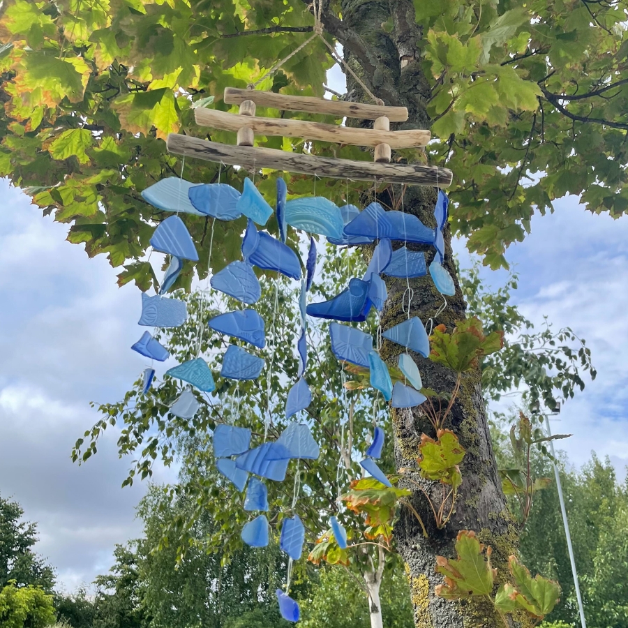 Dzwonek wietrzny wykonany z jasnoniebieskiego szkła, zawieszony na efektownej konstrukcji z naturalnych, drewnianych szczebelków. Liczne szklane fragmenty tworzą nieregularny, lekko kaskadowy układ, który pięknie prezentuje się na tle światła i wydaje subtelne dźwięki poruszane wiatrem. Dekoracja idealna do ogrodu, na balkon lub do wnętrz — wprowadza świeżość, kolor oraz oryginalny charakter do otoczenia.