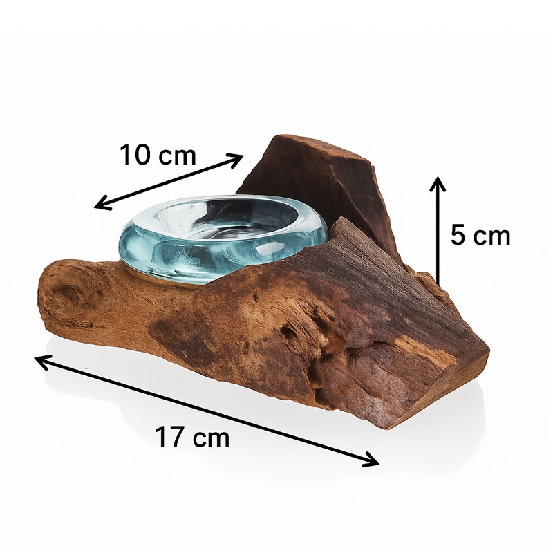 Świecznik wykonano z dwóch materiałów – szkła oraz naturalnego drewna, co tworzy interesujący kontrast między gładką, przezroczystą powierzchnią szkła a surową, nieregularną strukturą drewna. Szkło ma delikatny, błękitny odcień, który dodaje elegancji i lekkości całej kompozycji. Jest starannie uformowane, aby idealnie dopasować się do kształtu drewnianej podstawy i sprawia wrażenie, jakby było stopione i naturalnie wtopione w drewno. Drewno ma ciemny, ciepły kolor i zachowuje swoją naturalną fakturę, co nadaje całości rustykalnego charakteru. Świecznik posiada miejsce na jedną świeczkę tealight.
