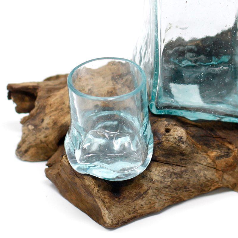 Szkło Wtopione W Drewno - Karafka. Wymiary: 26 x 27 x 33 cm. Ekskluzywny komplet składający się z ręcznie wykonanej karafki i dwóch szklanek, osadzonych na unikalnej podstawie z naturalnego drewna Gamal. Karafka o pojemności około 500 ml zachwyca swoim turkusowym zabarwieniem i kwadratową podstawą, która płynnie przechodzi w okrągłą szyjkę zwieńczoną eleganckim, szklanym korkiem. Dwie szklanki, o pojemności 70 ml, idealnie dopasowane stylistycznie, dopełniają całości, tworząc harmonijny zestaw. Wszystkie elementy zestawu zostały starannie osadzone na solidnym, surowym kawałku drewna o naturalnej fakturze i widocznych sękach. Jego chropowata, brązowa powierzchnia tworzy fascynujący kontrast z gładkością i przejrzystością szklanych naczyń.