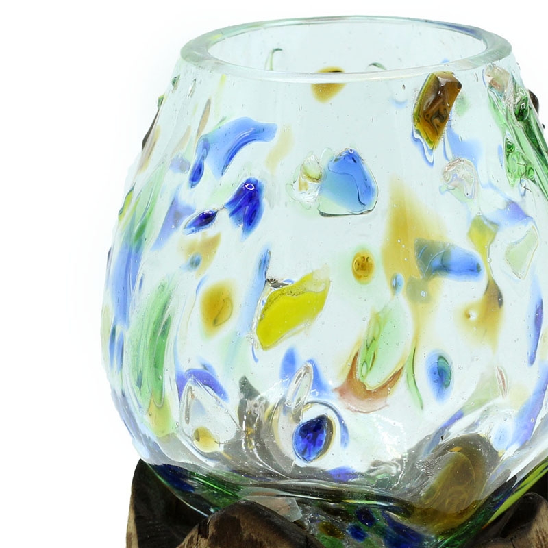 Szkło Wtopione W Drewno - Kolorowy wazonik. Wymiary: 18 x 13 x 12 cm. Ozdobne naczynie szklane, łączące szkło i drewno w harmonijną całość. Szkło o organicznym, falistym kształcie zachwyca różnobarwnymi plamkami – odcieniami niebieskiego, zielonego, żółtego i innych subtelnych kolorów, które razem tworzą efektowną mozaikę. Solidna drewniana podstawa, o surowej teksturze, doskonale kontrastuje z gładką powierzchnią szkła. Drewno chroni szkło przed uszkodzeniami, a szkło nadaje stabilności całej konstrukcji. To doskonały wybór dla tych, którzy cenią unikalne i stylowe dodatki do wnętrz.
