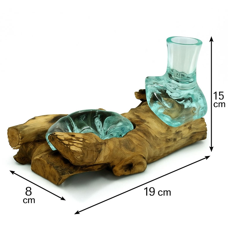 Szkło Wtopione W Drewno - Wazon i Świecznik. Wymiary: 19 x 8 x 15 cm. Odkryj wyjątkowy urok ręcznie wykonanego zestawu z wtopionego szkła i naturalnego drewna. Ten niepowtarzalny przedmiot łączy w sobie funkcjonalność i estetykę, oferując zarówno wazon, jak i świecznik w jednym. Starannie formowane szkło, wtapiając się w strukturę drewna, tworzy fascynującą harmonię materiałów. Świecznik i wazon doskonale współgrają, a ich przezroczysta powierzchnia podkreśla organiczne kształty i naturalne barwy drewna. Każdy zestaw jest jedyny w swoim rodzaju, ponieważ naturalna faktura drewna i nieregularne kształty szkła sprawiają, że żaden egzemplarz nie jest identyczny.