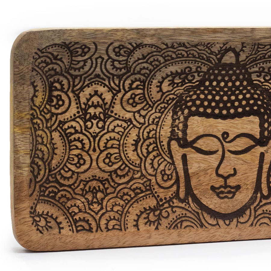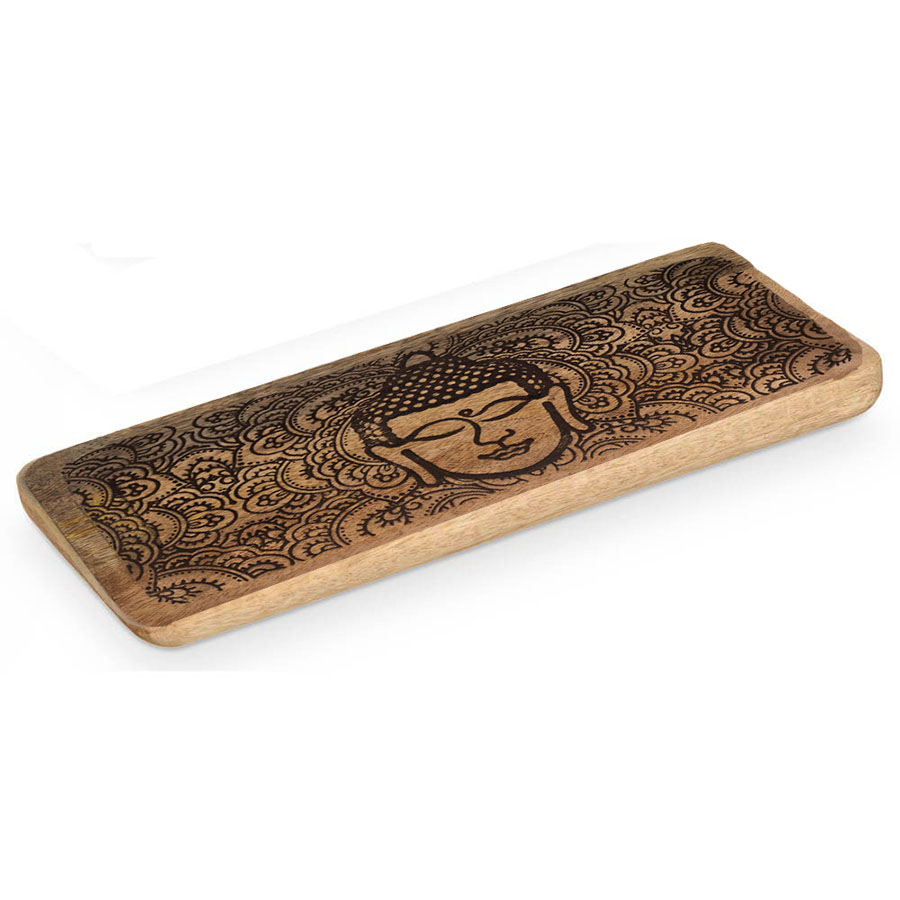 Taca drewniana długa - Twarz Buddy. Wymiary 30 x 15 x 2,5 cm. Drewniana, prostokątna taca z wizerunkiem Buddy to harmonijne połączenie