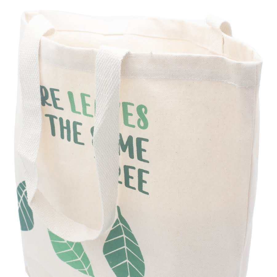 „We are leaves on the same tree” nadaje torbie wyjątkowego charakteru i podkreśla jej ekologiczny styl. Projekt wyróżniają proste, subtelne ilustracje liści w różnych odcieniach zieleni, które nie tylko