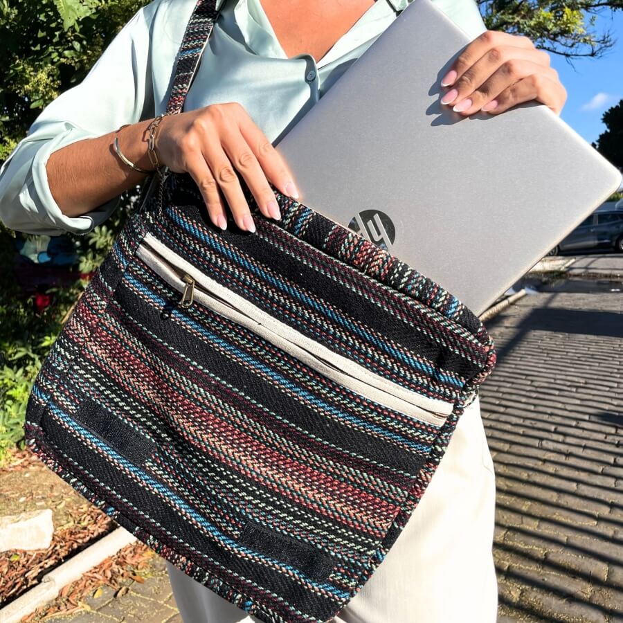 Torba na laptopa - Ciemne barwy. Potrzebujesz torby, która doskonale łączy styl z codzienną wygodą? Torba na laptopa w ciemne, wielokolorowe paski to idealna propozycja dla tych, którzy chcą
