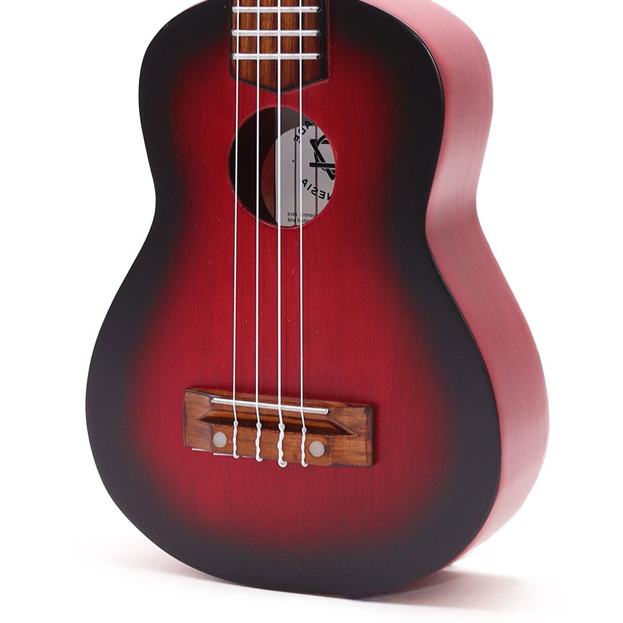 Ukulele ręcznie wykonane - Czerwone. Wymiary 20 x 6 x 58 cm. Unikalny, ręcznie wykonany instrument pochodzący z Jawy w Indonezji, w czerwonej kolorystyce, z subtelnym cieniowaniem do czerni. Łączy w sobie
