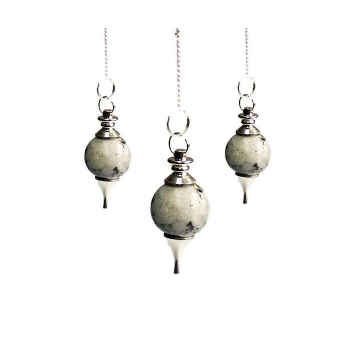 Wahadło radiestezyjne kuliste - Kamień Księżycowy. Wymiary 2 x 1 cm. Łańcuszek 17 cm. Wahadło sferyczne, znane również jako wahadło sferyczne lub wahadło stożkowe, jest układem fizycznym składającym się z masy (zwykle kuli) przymocowanej do stałego punktu za pomocą sznurka lub pręta. Masa może swobodnie kołysać się w dwuwymiarowej płaszczyźnie, tworząc kształt stożka.