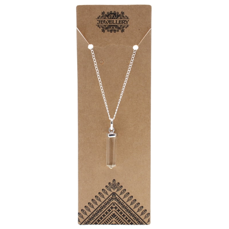 Wisiorek klasyczny ołówkowy - Kwarc Skalny. Wymiary rzeźby 3,5 x 1 x 1 cm. Pięknie rzeźbione wisiorki z kamieni szlachetnych wraz z dołączonym posrebrzanym łańcuszkiem o długości