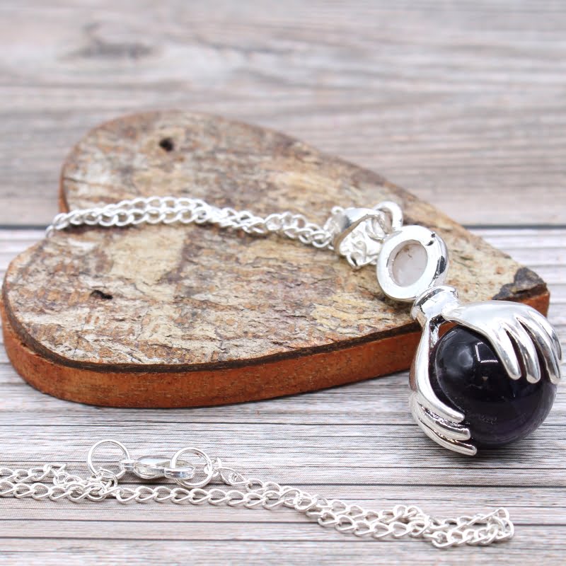 około 45 cm. Wisiorek zawiera kulę wykonaną z kamienia szlachetnego, osadzoną w posrebrzanym mocowaniu w kształcie dłoni. Kształt wisiorka to wyjątkowy i kreatywny sposób na pokazanie piękna i energii kamienia szlachetnego. Często noszony jako ochronny talizman lub amulet.