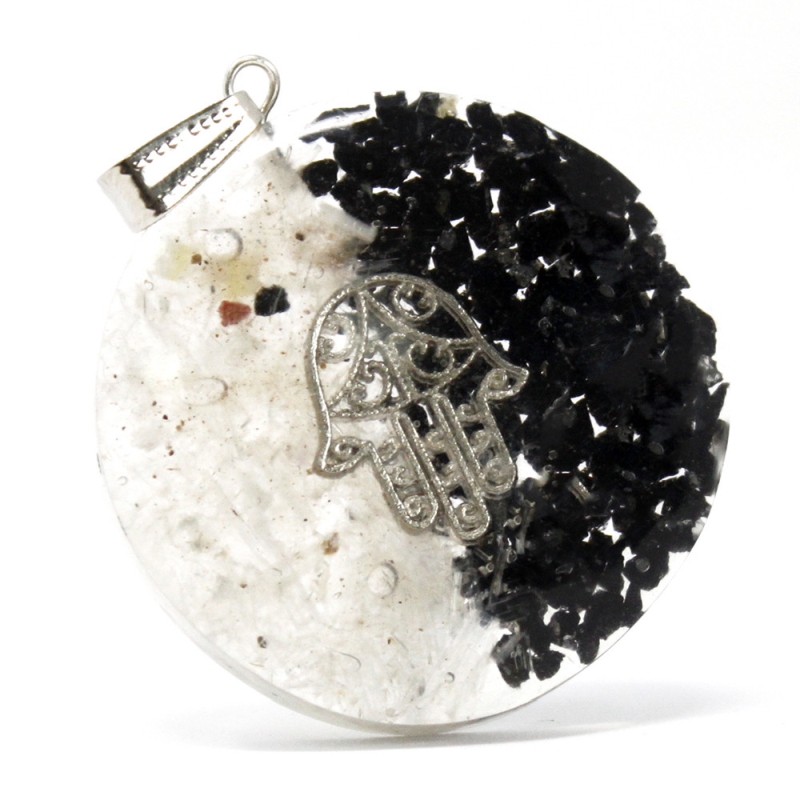 Wisiorek z Orgonitem - Hamsa. Wymiary 4 x 0,5 cm. Elegancki i oryginalny wisiorek na szyję. Wykonany z kawałków kamieni szlachetnych, miedzi, opiłków metalu. Zawierają zatopione ezoteryczne przedmioty - są naprawdę mistycznymi przedmiotami. Orgonit zawiera