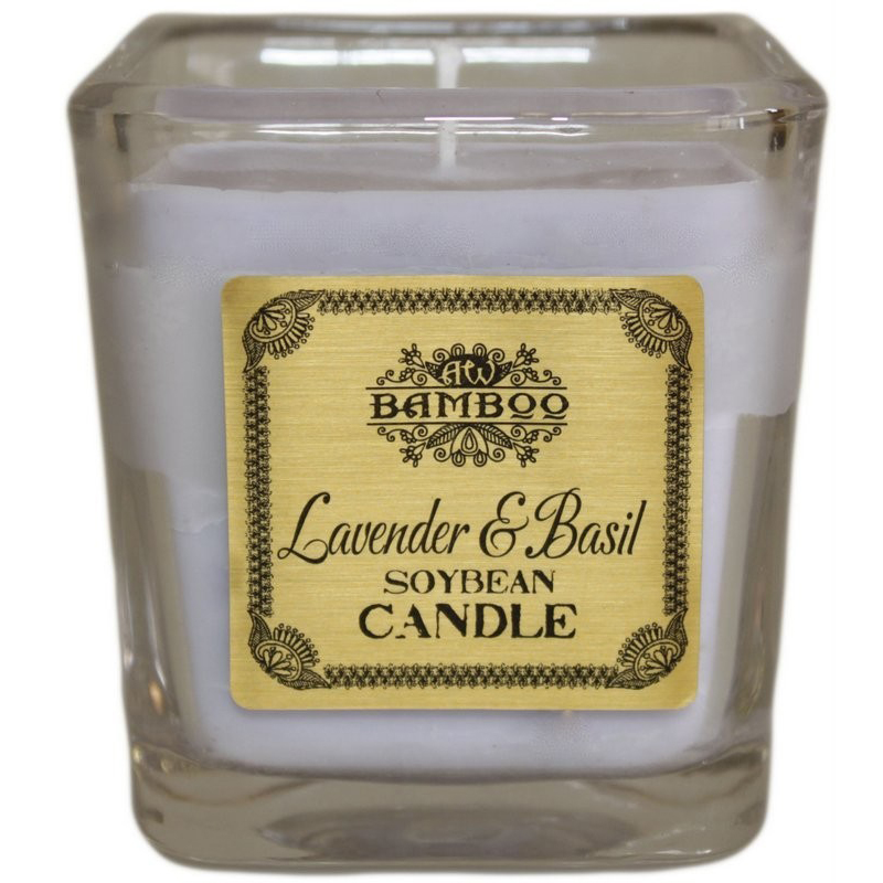 Zapachowa świeca sojowa - Lawenda i Bazylia. Wymiary 7 x 7 x 8 cm. Doskonała seria świec zapachowych umieszczonych w dużych, szklanych pojemnikach z recyklingu. Wykonana z