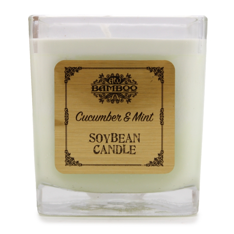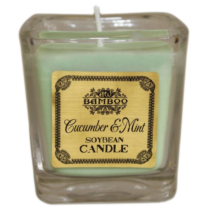Zapachowa świeca sojowa - Ogórek i Mięta. Wymiary 7 x 7 x 8 cm. Doskonała seria świec zapachowych umieszczonych w dużych, szklanych pojemnikach z recyklingu. Wykonana z