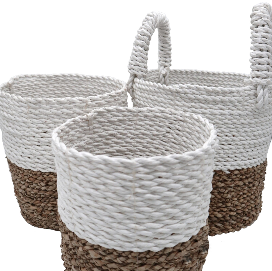 Ręcznie pleciony kosz z naturalnych materiałów w dwóch odcieniach: białym i naturalnym brązowym. Wyrazista pleciona faktura podkreśla rzemieślnicze wykonanie, nadając mu unikalny charakter. Kosz posiada wygodny uchwyt, który ułatwia przenoszenie i zwiększa jego funkcjonalność. Dzięki starannie dobranej kolorystyce kosz doskonale komponuje się z wnętrzami w stylu boho oraz rustykalnym, stanowiąc zarówno praktyczny, jak i dekoracyjny element. Idealny jako osłona na doniczki, kosz prezentowy, torba na zakupy czy pojemnik na drobne pranie. Naturalna estetyka i wszechstronne zastosowanie sprawiają, że kosze z trawy morskiej cieszą się rosnącą popularnością.
