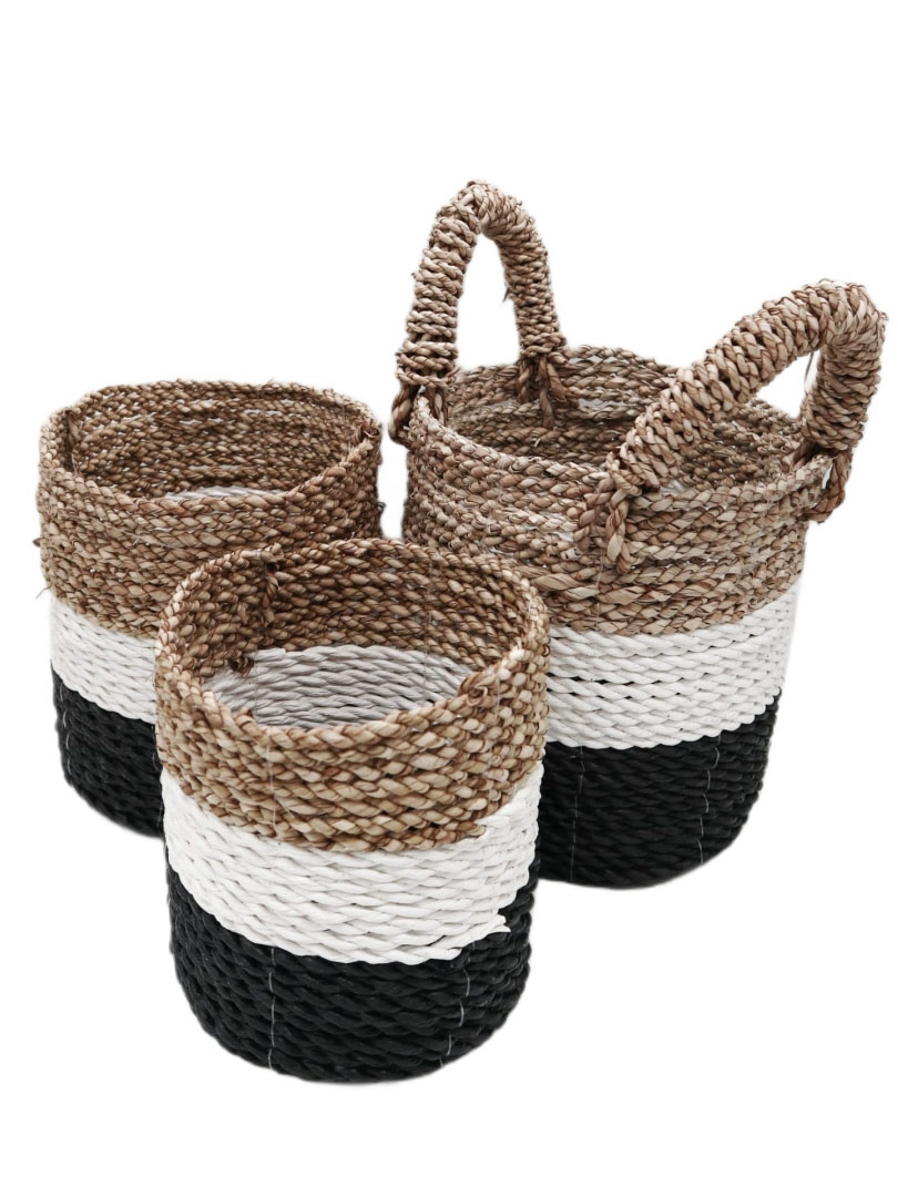 Ręcznie wyplatane koszyki z naturalnych surowców, barwione dawnymi sposobami w trzech tonacjach: śnieżnobiałej, przyrodzonej brązowej i hebanowej. Oferowane w komplecie trzech egzemplarzy, znakomicie sprawdzą się jako ozdobny akcent, osłonki na donice, kosze upominkowe, siatki na sprawunki czy funkcjonalne pojemniki na drobną bieliznę. Największy z nich wyposażony jest w poręczny uchwyt, ułatwiający transport.