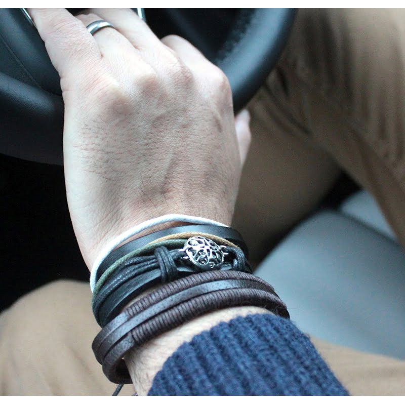 Ten zestaw męskich bransolet to kwintesencja nowoczesnego, miejskiego stylu. Połączenie głębokiej czerni z chłodną szarością tworzy bardzo elegancką kompozycję. W rezultacie biżuteria ta pasuje niemal do każdej męskiej stylizacji. Kilka rzemyków noszonych na raz zapewnia modny, warstwowy wygląd. Ponadto ciemna kolorystyka sprawia, że dodatki te są bardzo uniwersalne. Dzięki temu komplet świetnie prezentuje się obok klasycznego zegarka. Jest to rzetelny wybór dla osób ceniących stonowany design.